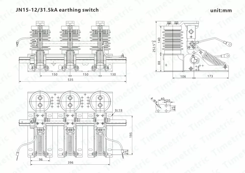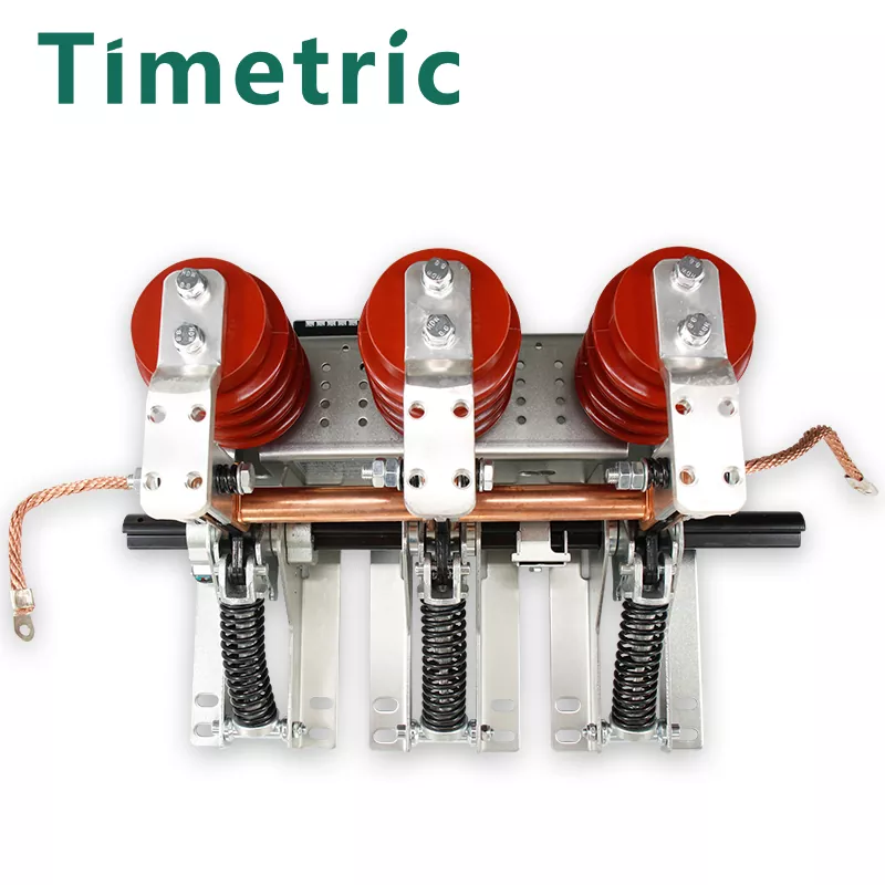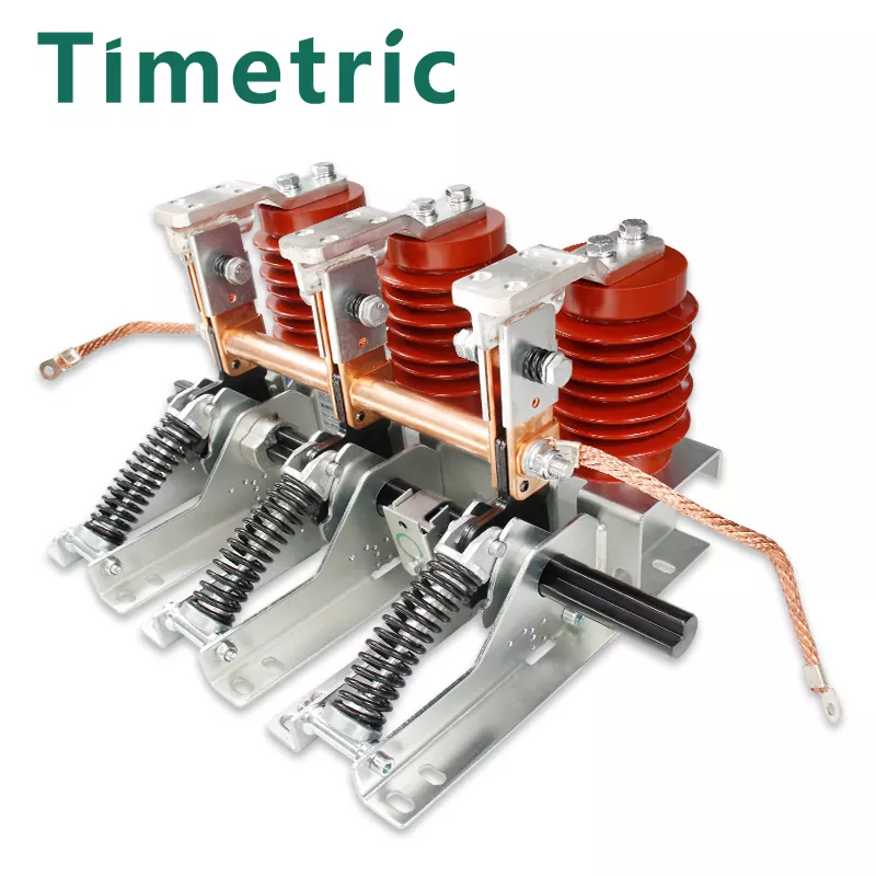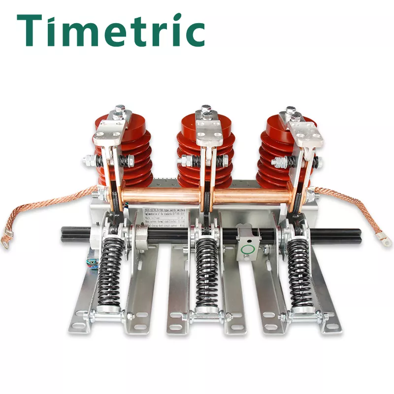 Timetrisen sähköisen tuottama JN15-12KV sisätiloissa 150 mm: n vaiheen etäisyyden maadoituskytkin koostuu kiinnikkeestä, maadoitusveitsikokoonpanosta, staattisesta kosketuksesta ja anturista. Kiinnike on hitsattu ohuista teräslevyistä. Sen toimintaperiaate on, että toimintamekanismi ajaa pääakselin kiertämään käyttämällä puristusjouseen tallennettua energiaa nopean avaus- ja sulkemisoperaatioiden saavuttamiseksi. Sulkemisen yhteydessä maadoitusveitsi ja staattinen kosketus kosketetaan luotettavasti jousen kautta. Tuotteessa on kompakti rakenne, kevyt, joustava toiminta, helppo asennus ja vahva dynaaminen lämpöstabiilisuus. Sen avaus- ja sulkeutumisnopeus ei vaikuta manuaaliseen toimintanopeuteen. Kun toimintamekanismi sulkee maadoituskytkimen, pääakselina toimiva vääntömomentti ylittää vastusmomentin, ajaen kampiharjaa kiertämään sulkemissuuntaa. Tämä aiheuttaa maadoitusveitsen käyttövivun puristusjousen kuolleen pisteen, vapauttaen energian ja sulkemaan nopeasti maadoituskytkimen. Maadoitusveitsikokouksen maadoitusveitsi koskettaa tiukasti ja luotettavasti staattisen kosketuksen laippaa puristusjousen kautta. Avausoperaation aikana käytetty vääntömomentti saa pääakselin voittamaan päämomentin ja jousen voiman, ajaen kampiharjaa pyörimään avaussuunnassa. Tämä saa maadoitusveitsen puristusjousen kulkemaan kuolleen pisteen läpi, loppuun saattamalla energian varastointiprosessin ja valmistautumaan seuraavaan sulkemiseen. Maadoituskytkin ja sulkemisnopeus ovat riippumattomia käyttäjän käyttöopeudesta.